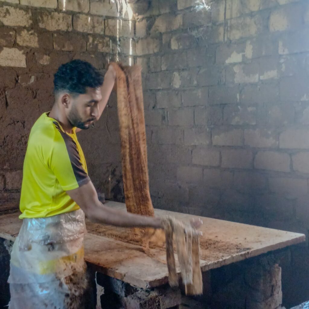 I watched the process unfold: the papyrus plant, carefully cultivated and harvested, then peeled and sliced into fine strips. These strips are soaked in water until soft, then boiled for over fifteen hours on a wood fire. Once softened, they’re pounded with wooden mallets and arranged in two layers — vertical and horizontal — like a woven fabric of time. Pressed and dried under the Egyptian sun, they become a new sheet, filled with the soul of the land.